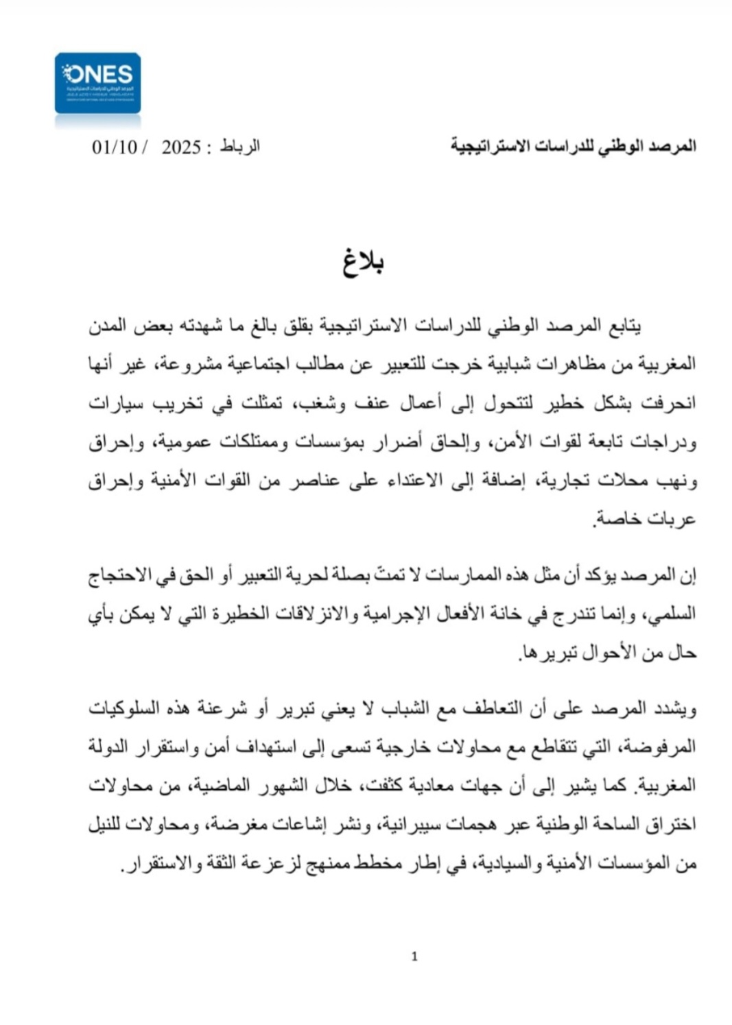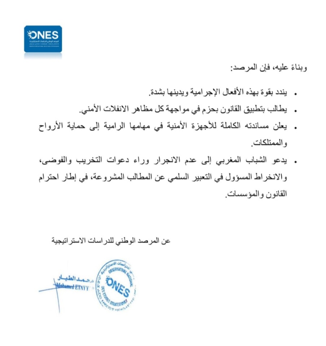 أصدر المرصد الوطني للدراسات الاستراتيجية بلاغاً أعرب فيه عن “قلقه البالغ” إزاء ما شهدته بعض المدن المغربية من مظاهرات شبابية خرجت للتعبير عن مطالب اجتماعية مشروعة، قبل أن تنحرف نحو أعمال عنف وشغب، تمثلت في تخريب ممتلكات عمومية وخاصة، وإحراق ونهب محلات تجارية، فضلاً عن الاعتداء على عناصر من القوات الأمنية.