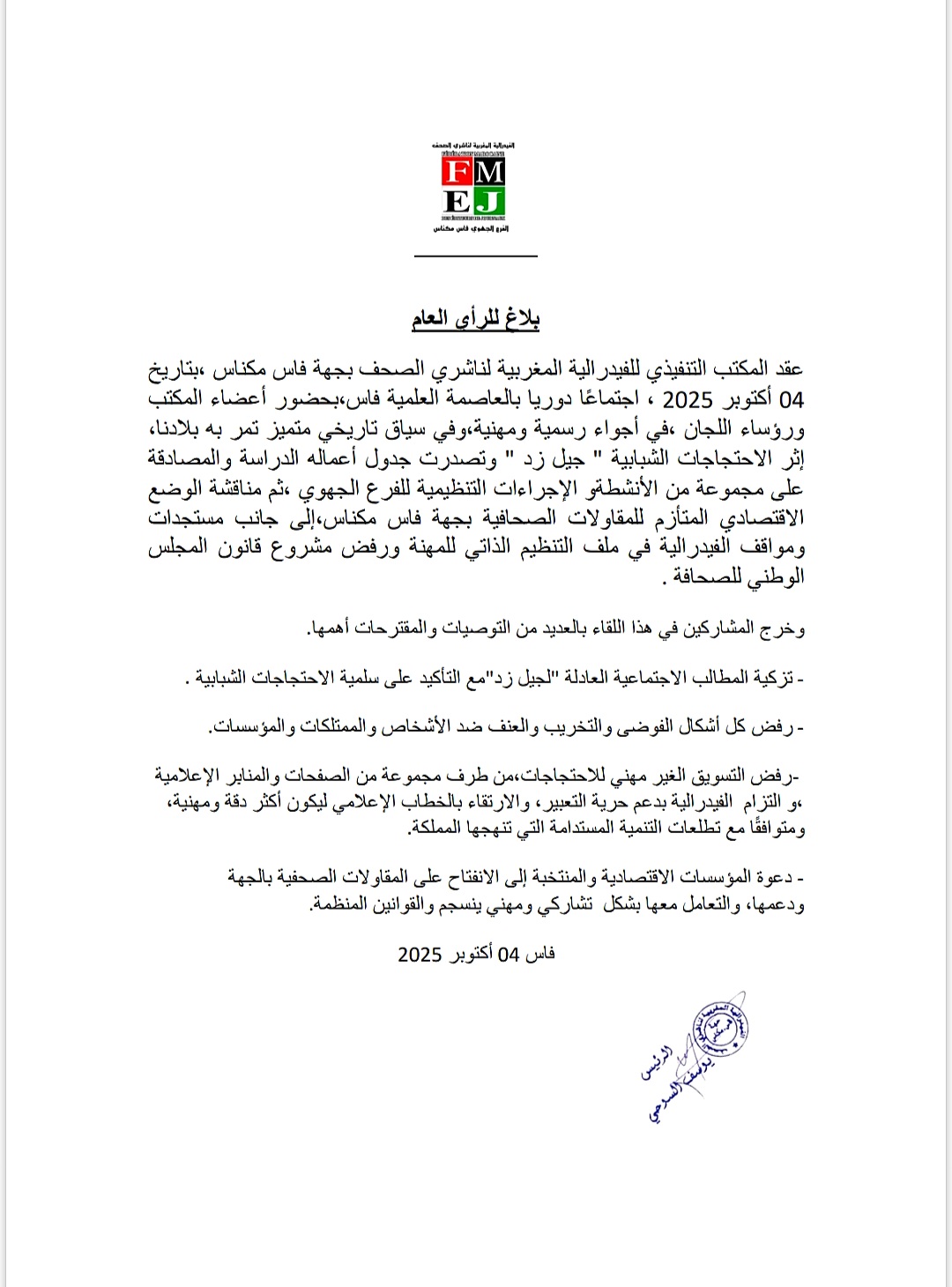 عقد المكتب التنفيذي للفيدرالية المغربية لناشري الصحف بجهة فاس مكناس ،بتاريخ 04 أكتوبر 2025 ، اجتماعًا دوريا بالعاصمة العلمية فاس،بحضور أعضاء المكتب ورؤساء اللجان ،في أجواء رسمية ومهنية،وفي سياق تاريخي متميز تمر به بلادنا، إثر الاحتجاجات الشبابية ” جيل زد ” وتصدرت جدول أعماله الدراسة والمصادقة على مجموعة من الأنشطةو الإجراءات التنظيمية للفرع الجهوي ،ثم مناقشة الوضع الاقتصادي المتأزم للمقاولات الصحافية بجهة فاس مكناس،إلى جانب مستجدات ومواقف الفيدرالية في ملف التنظيم الذاتي للمهنة ورفض مشروع قانون المجلس الوطني للصحافة .