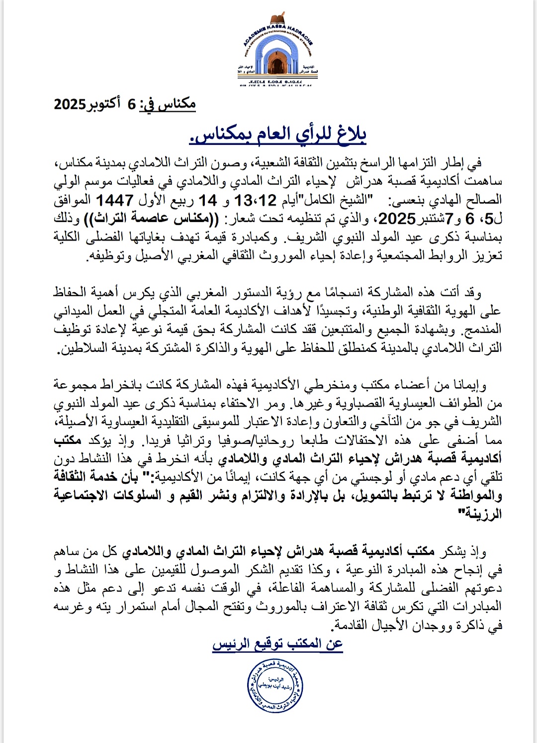 . في إطار التزامها الراسخ بتثمين الثقافة الشعبية، وصون التراث اللامادي بمدينة مكناس، ساهمت أكاديمية قصبة هدراش لإحياء التراث المادي واللامادي في فعاليات موسم الولي الصالح الهادي بنعسى: “الشيخ الكامل” أيام 12،13 و 14 ربيع الأول 1447 الموافق ل5، 6 و7شتنبر2025، والذي تم تنظيمه تحت شعار: ((مكناس عاصمة التراث)) وذلك بمناسبة ذكرى عيد المولد النبوي الشريف. وكمبادرة قيمة تهدف بغاياتها الفضلى الكلية تعزيز الروابط المجتمعية وإعادة إحياء الموروث الثقافي المغربي الأصيل وتوظيفه.