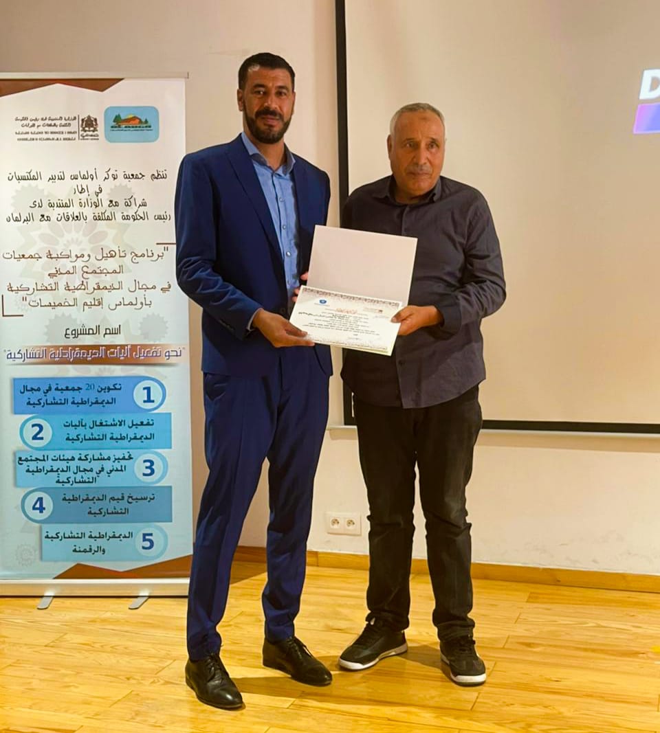 الحفل الختامي للبرنامج التكويني حول الديموقراطية التشاركية والذي نظّمته الجمعيتين المحليتين توكر أولماس لتدبير المكتسبات و أولماس للبيئة والتنمية المستدامة والتضامن بشراكة مع الوزارة المنتدبة لدى رئيس الحكومة المكلفة بالعلاقات مع البرلمان – قطاع العلاقات مع المجتمع المدني