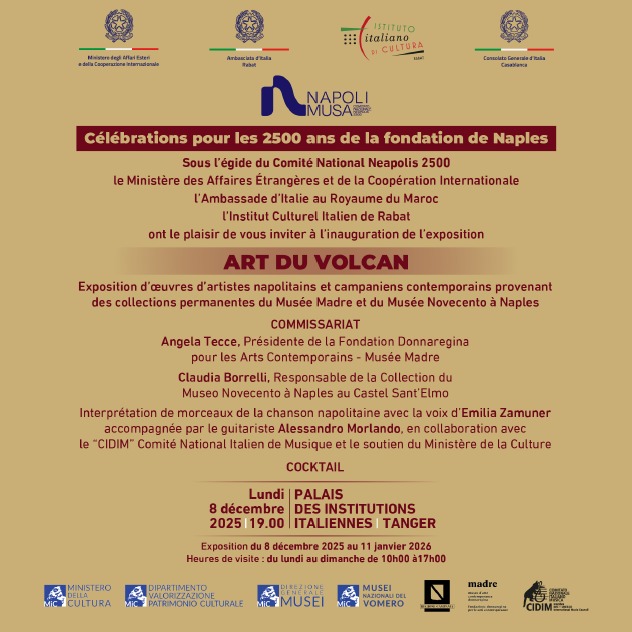 المعرض، الذي يحمل عنوان “فن البركان”، سيفتتح مساء الإثنين 8 دجنبر الجاري في قصر المؤسسات الإيطالية، بدعوة من وزارة الخارجية الإيطالية والمعهد الثقافي الإيطالي بالرباط، بشراكة مع السفارة الإيطالية بالمغرب، وتحت إشراف لجنة “نيابوليس 2500”.