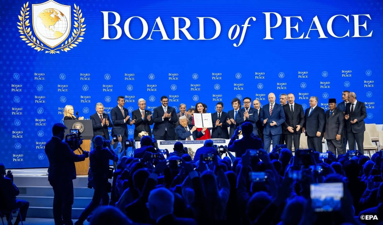 وشهد حفل توقيع ميثاق مجلس السلام، المنظم على هامش المنتدى الاقتصادي العالمي بدافوس، مشاركة نحو 20 من رؤساء الدول والحكومات وكذا وزراء شؤون خارجية الدول الموقعة، ومنها على الخصوص، تركيا والمملكة العربية السعودية ومملكة البحرين ومصر وإندونيسيا وأذربيجان والأرجنتين…