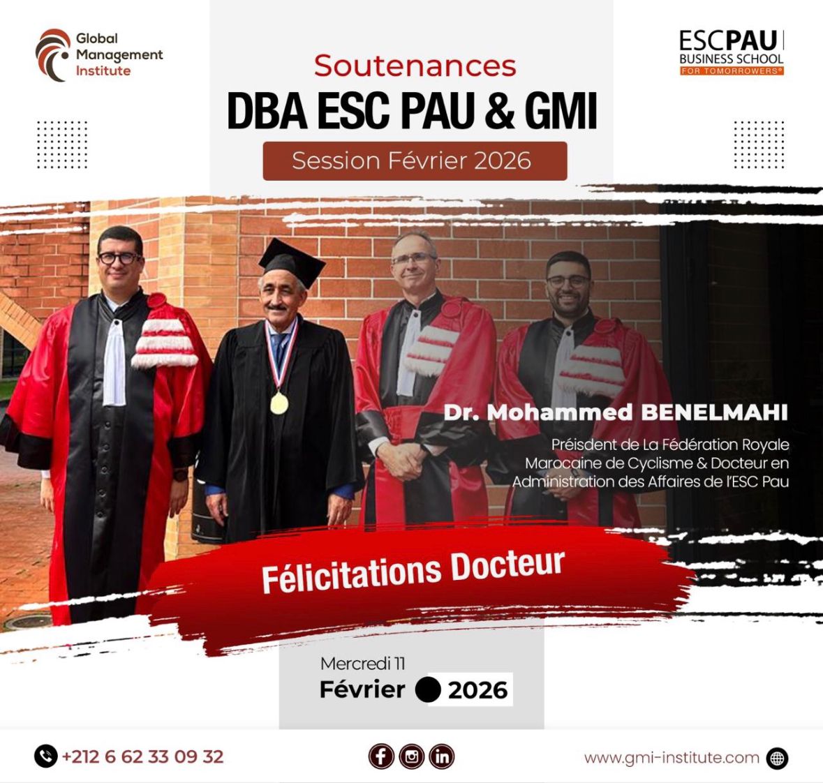 ناقش الأستاذ محمد بن الماحي المحامي بمكناس ورئيس الجامعة الملكية المغربية للدراجات أطروحته لنيل درجة الدكتوراه في إدارة الأعمال (DBA)، المنجزة في إطار برحاب جامعة بو – Université de Pau)، بشراكة مع Global Management Institute. وقد حصل على درجة امتياز مع تهنئة اللجنة العلمية.