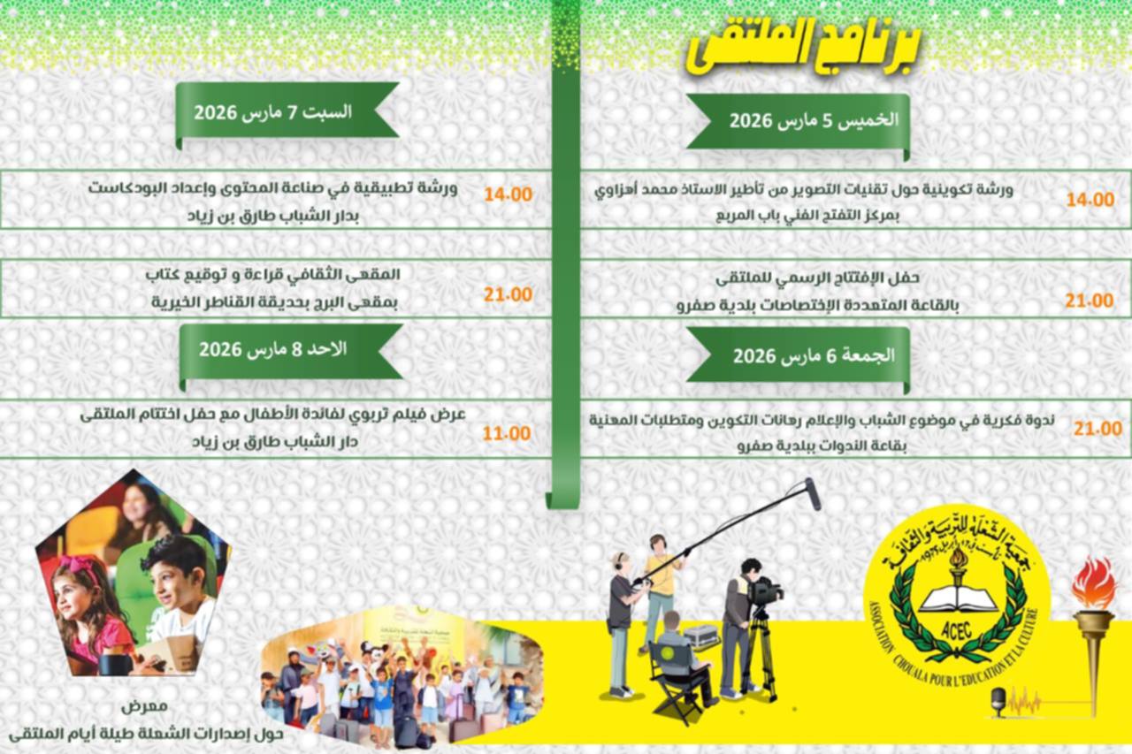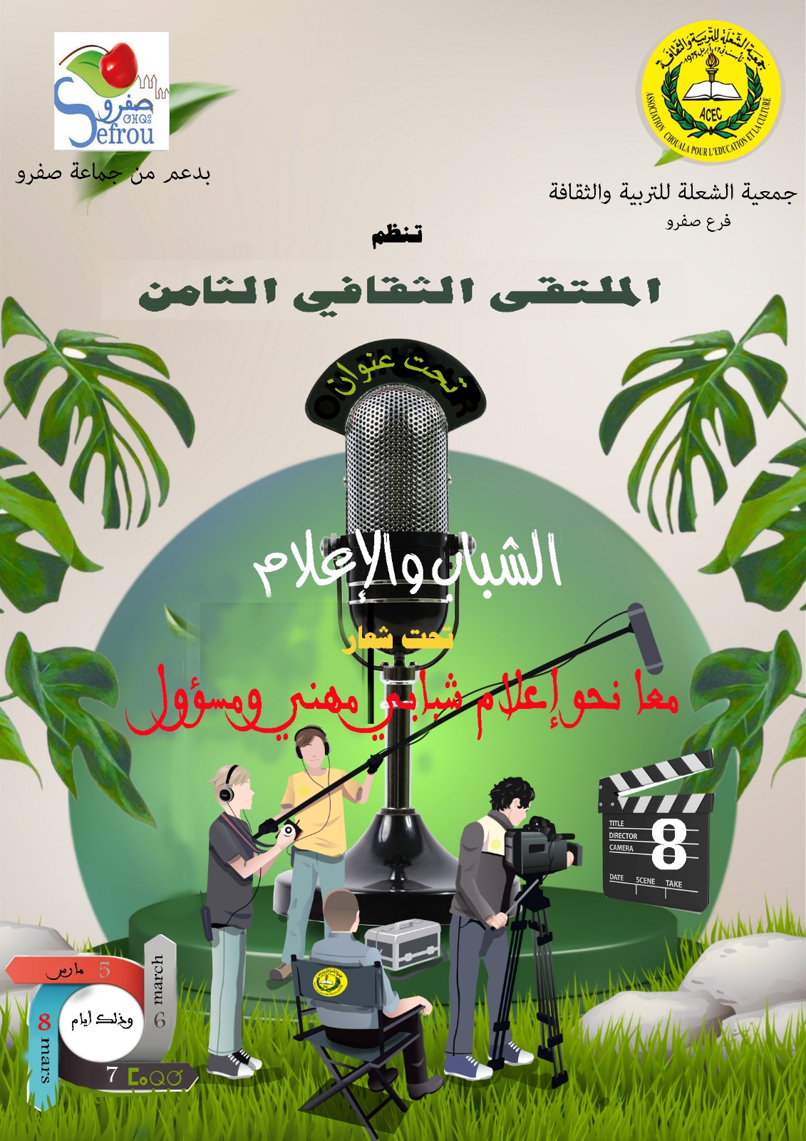 تستعد جمعية الشعلة للتربية والثقافة – فرع صفرو لتنظيم الملتقى الثقافي الثامن خلال الفترة الممتدة من 5 إلى 8 مارس 2026، تحت شعار: “الشباب والإعلام… معا نحو إعلام شاب هادف ومسؤول”، في إطار سعيها إلى تعزيز حضور الشباب في المشهد الإعلامي والثقافي وترسيخ قيم الإبداع والمسؤولية المهنية.