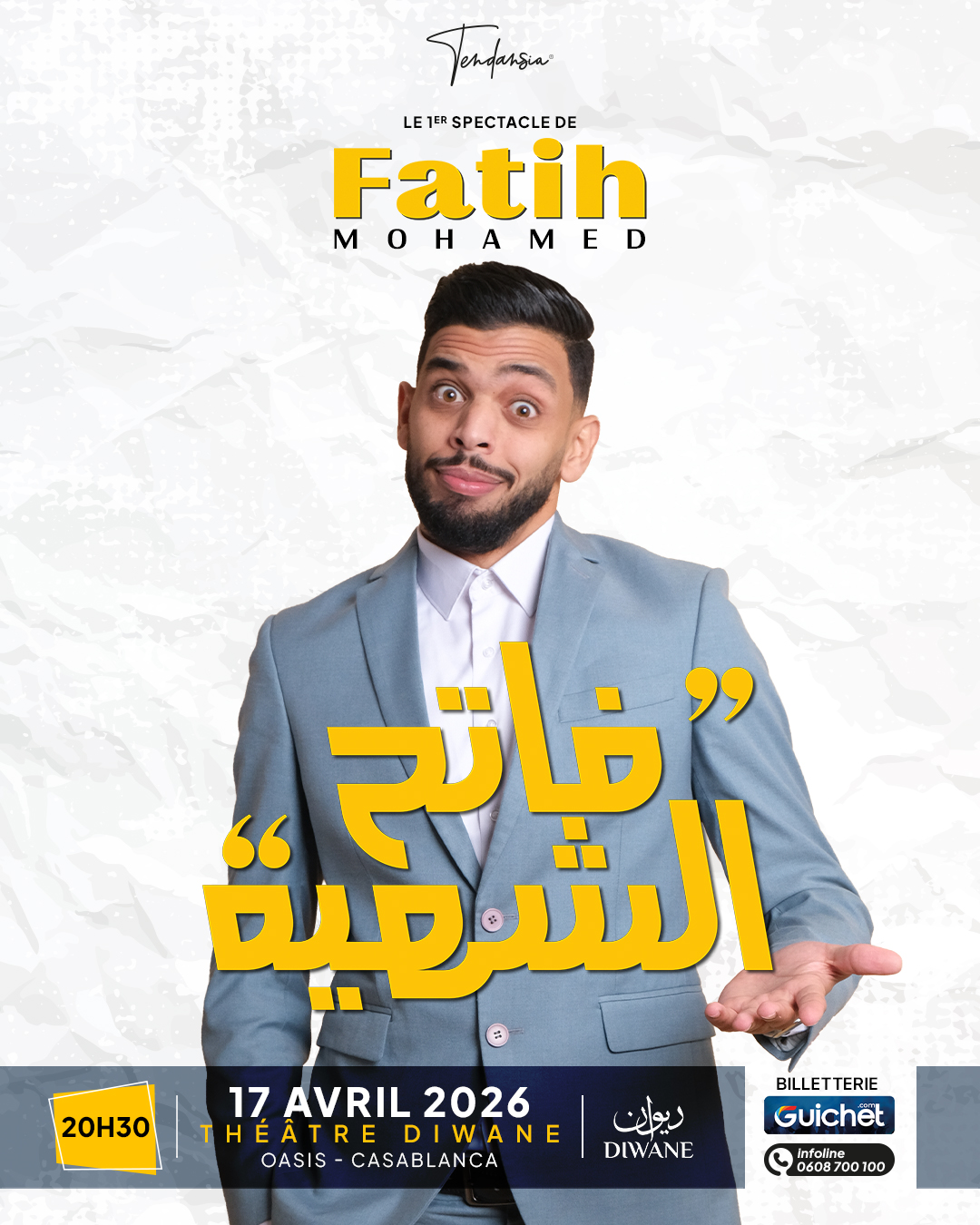 يستعد الكوميدي محمد فاتح لتقديم عرضه الفكاهي “فاتح الشهية”، وذلك يوم 17 أبريل 2026 على الساعة الثامنة والنصف مساءً بمسرح “Diwane Arts” بحي Oasis في الدار البيضاء، في موعد فني يحتفي من خلاله بمرور عشر سنوات على انطلاق مسيرته على خشبة المسرح.