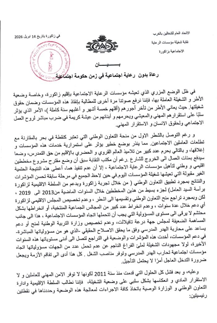 في ظل الوضع المزري الذي تعيشه مؤسسات الرعاية الاجتماعية بإقليم زاكورة، وخاصة وضعية الأطر و الشغيلة العاملة بها، فإننا نرفع صوتنا مرة أخرى للمطالبة بإنقاذ هذه المؤسسات وضمان حقوق شغيلتها. حيث يعاني الأطر من تأخر أجورهم (أقلهم خمسة أشهر و أغلبهم سنة كاملة )، الأمر الذي يؤثر سلبًا على استقرارهم المهني والمعيشي ويحرمهم و أبنائهم من عيشة كريمة في ضرب مباشر لروح العمل الاجتماعي ولحقوق الانسان و الاستقرار المهني.